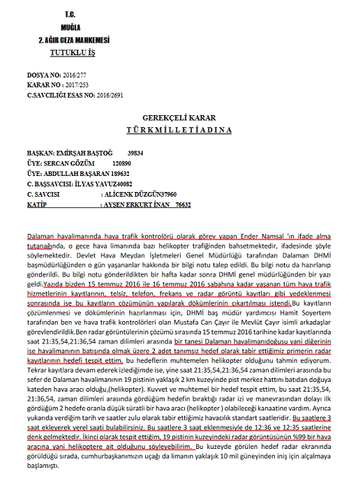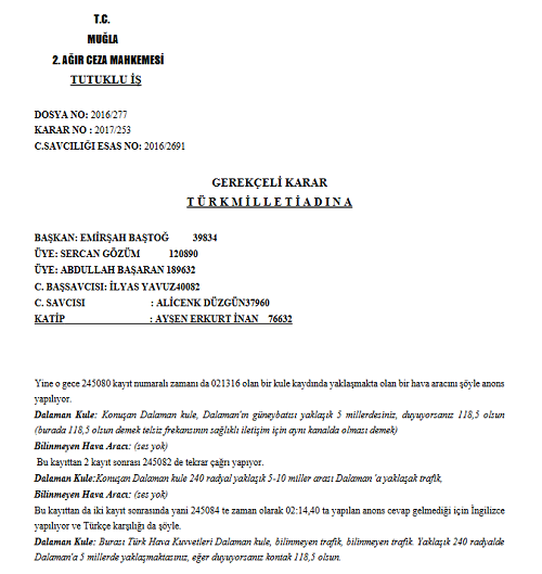 Im Vernehmungsprotokoll von Ender Namsal, der als Fluglotse am Flughafen Dalaman tätig ist, wird erwähnt, dass es in jener Nacht bestimmten Hubschrauberverkehr am Flughafen gab.