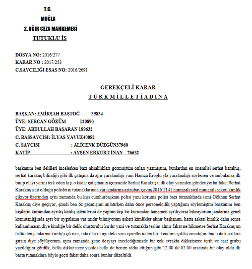 Doch in den Protokollen der Polizei steht, dass zu Serhat Karakuş gehört, dass ein Unteroffizier der Gendarmerie, mit der Dienstnummer 2016 T141, über „Çakır“ zugleich vermerkt ist, und gleichzeitig ist diese Person als Gökhan Serhat Karakuş in den Wassertank-Basislisten der Polizei für den Schutz des Präsidenten eingetragen.