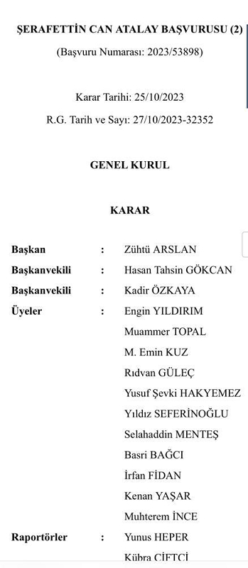 Die Entscheidung des Verfassungsgerichts vom 25.10.2023 über die Individualbeschwerde des Beschwerdeführers Şerafettin Can Atalay vom 20.07.2023 (Nr. 2023/53898) wurde unserer Kammer durch das Generalsekretariat des Verfassungsgerichts übermittelt. Die besagte Entscheidung wurde im Amtsblatt vom 27.10.2023 veröffentlicht.