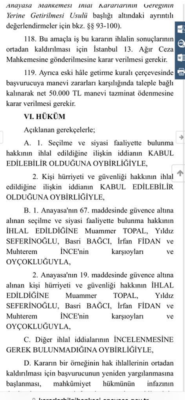 Das Verfassungsgericht stellte fest, dass seine Inhaftierung eine Verletzung der Rechte darstellt, und verwies den Fall an das zuständige Gericht, das 13. Schwurgericht Istanbul.