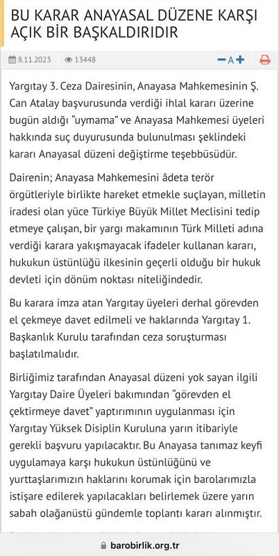 Die heutige Entscheidung des 3. Strafsenats des Kassationsgerichts (Yargıtay), die Verletzungsentscheidung des Verfassungsgerichts im Fall Ş. Can Atalay „nicht zu befolgen“ und Strafanzeige gegen die Mitglieder des Verfassungsgerichts zu erstatten, ist ein Versuch, die verfassungsmäßige Ordnung zu ändern.