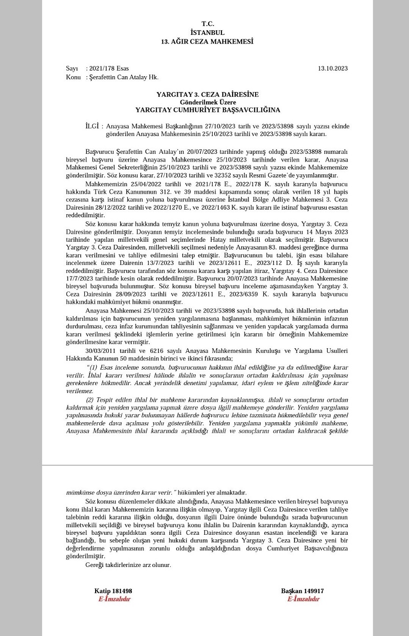 Aktenzeichen: 2021/178 Hauptsache (Esas) — Datum: 13.10.2023 Betreff: Über Şerafettin Can Atalay.